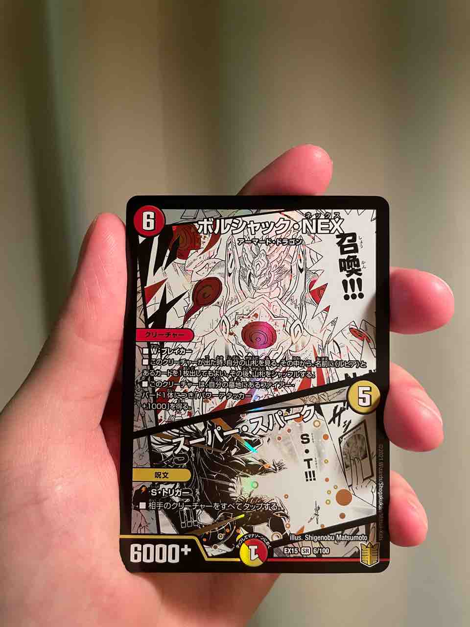 もともと別個のカードとして存在していた『ボルシャック・NEX』と『スーパー・スパーク』が1枚のカードになったもので、カードの上半分がクリーチャー、下半分が呪文になっている“ツインパクト”という特殊なカードタイプだ。